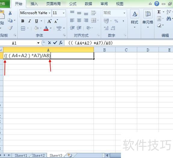 第三步:在((A4+A2)*A7)后继续输入/A8,并用一对小括号将整个表达式括起,公式变为(((A4+A2)*A7)/A8)。该公式表示先计算A4与A2的和,再将结果乘以A7,最后将乘积除以A8,运算顺序由括号明确限定,所示。