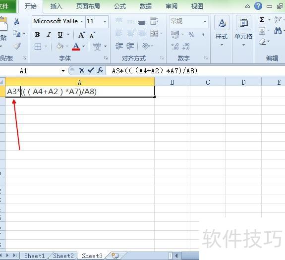 第四步:在原公式((A4+A2)*A7)/A8前方添加A3*,使公式变为A3*((A4+A2)*A7)/A8,表示先计算括号内的加法与乘法,得出结果后再与A3相乘。所示。