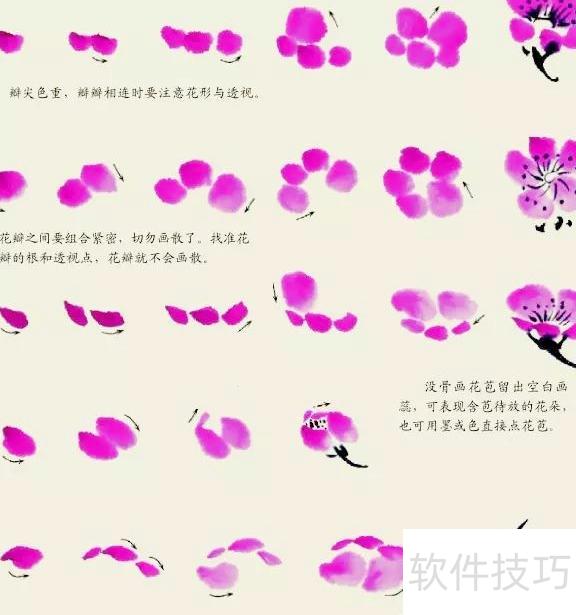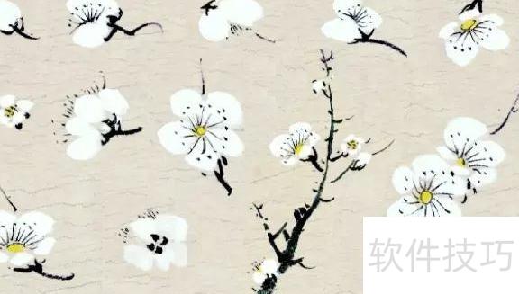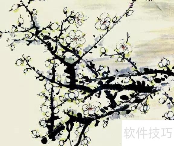 绘制没骨白梅宜选用国画白粉颜料与色宣纸,因色宣能衬托白粉,凸显花朵的生动色泽。先以清水笔调白粉于笔腹,笔尖蘸浓粉,依花形有章法地点瓣,表现不同形态与透视关系。待白粉干后,再勾画花蕊,点染花心。