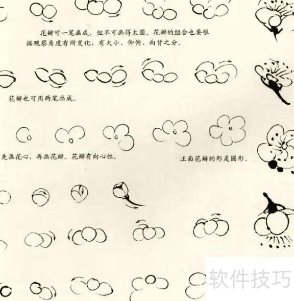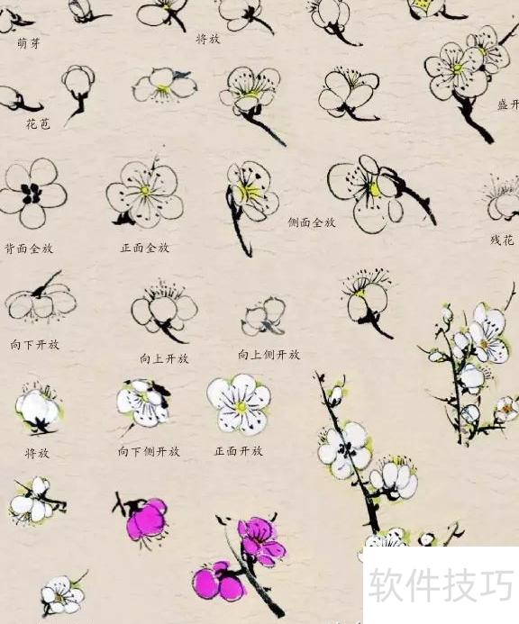 梅花常见为五瓣圆形,具花心与花蕊,花色以红、白、绿为主。形似者有杏、桃、梨花。绘画常用勾勒与没骨技法表现。