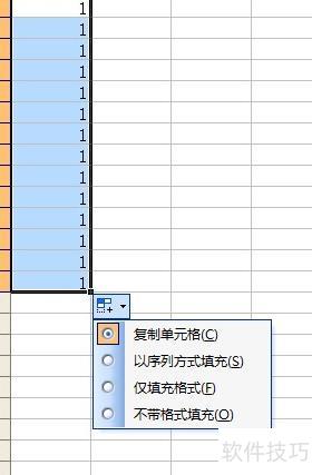 Excel自动填充默认复制单元格内容,若选中下拉方式填充,同样执行复制操作。
