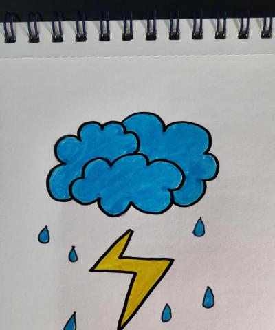单独的闪电可能有些单调,我们可以把它放进场景里,比如,画在乌云下方,配上几滴雨点,或者,劈在一棵大树上,增加故事性,这样,画面就完整了,也更有趣味。