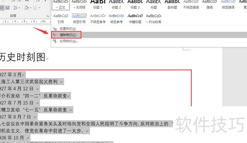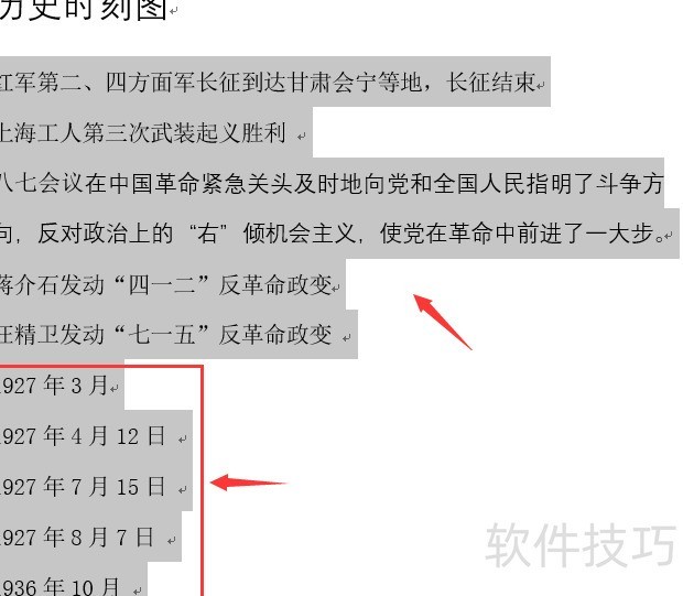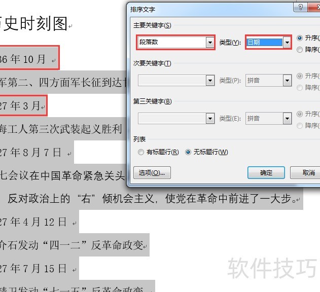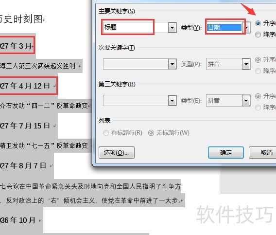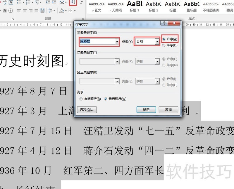 全选文本区域,点击段落排序,设条件为段落数,类别为日期,选择升序排列。