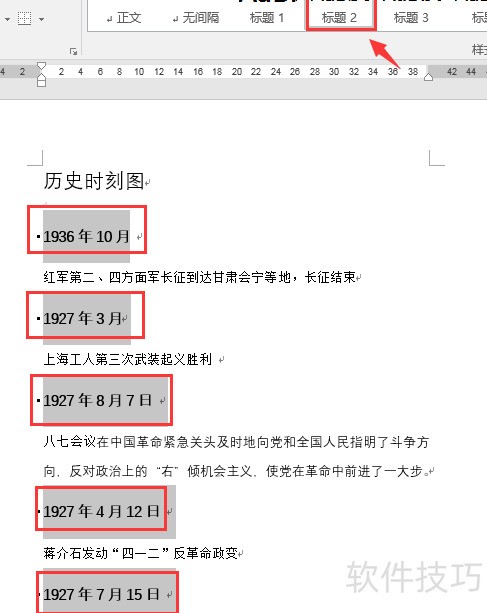 按住Ctrl键多选段落,设为标题2,进入排序功能,按标题中的日期升序排列。