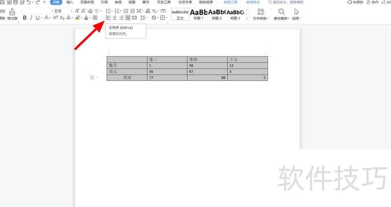 在开始菜单中选择左对齐,即可完成内容对齐操作。