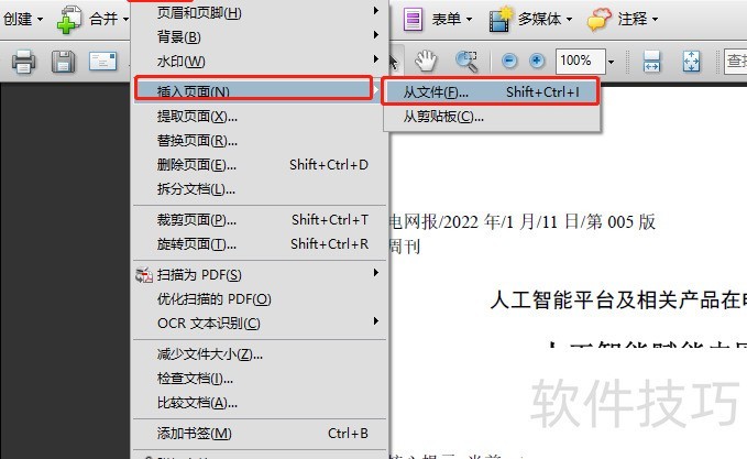 接下来演示如何合并PDF文件。在同一文档基础上,将当前PDF与其他PDF合并为一个文件。点击顶部工具栏中的文档,选择插入页面,再点击从文件选项,即可完成操作。