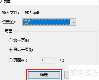 在弹出的对话框中选择插入位置,可置于当前文件前后或指定页前后,此处选择插入到最后一页之后,确认无误后点击确定即可完成操作。