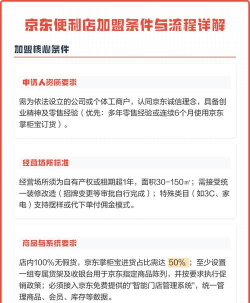 1、加盟京东便利店,需要满足哪些基本条件你得有个合适的店面,位置很重要,最好在社区附近,或者,人流量大的地方,面积也有要求,一般不能太小,你需要有一定的资金储备,用于前期投入,以及,后续的运营周转,当然,你还得认同京东的经营理念,愿意遵守总部的管理规定,你需要有合法的经营资质,比如,营业执照等,这些都是硬性条件,缺一不可。