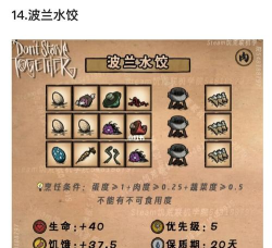 1、游戏内的基础配方与效果我们来看看游戏里的做法,波兰水饺的配方是,一个肉,一个蛋,一个蔬菜,再加一个填充物,这里的肉,可以是怪物肉或小肉,蛋就是鸟蛋,蔬菜比如胡萝卜或浆果,填充物可以是树枝或冰块,但要注意,不能放两个怪物肉,否则会做出怪物千层饼,成功做出波兰水饺后,它能恢复40点生命值,37.5点饥饿值,以及5点精神值,效果非常全面,是中期探索的必备食物。