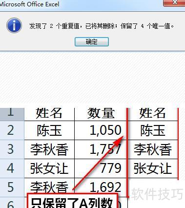 点击后,C列重复数据将被删除,仅保留唯一值,结果所示。