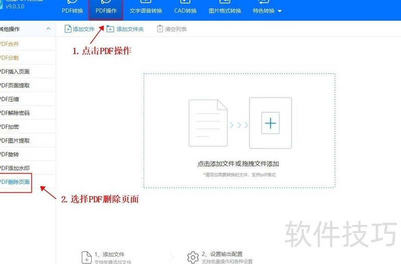 该PDF转换器支持删除页面功能,下载安装后,打开软件并点击右侧的,选择,随后在左侧工作区中导入或拖入需要处理的PDF文件即可完成操作。