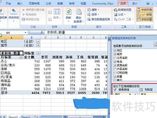 在右侧数据透视表字段列表中,将地区和城市移至报表筛选,姓名移至列标签,类别名称移至行标签,求和项移至数值区域。