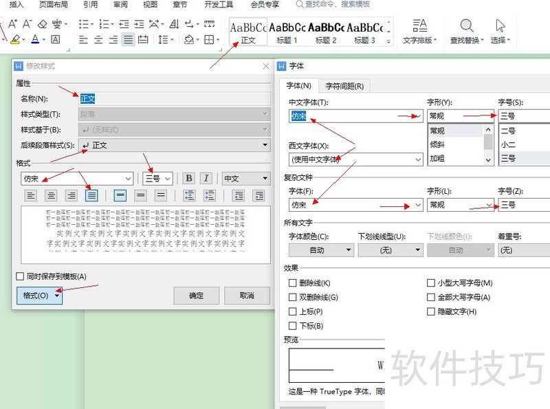 点击对话框左下角的格式,依次设置字体与段落,确认字体已设为仿宋三号常规样式。