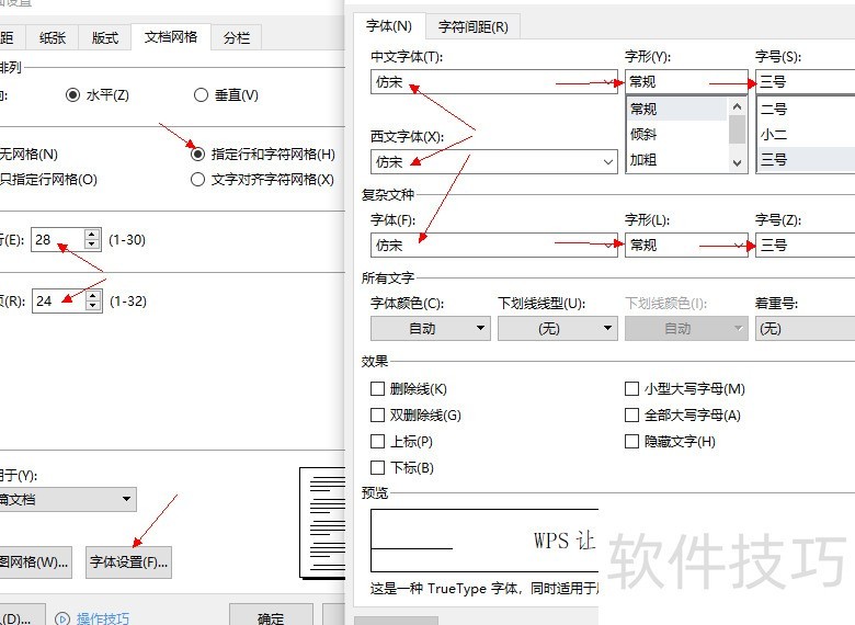 设置文档网格,每行28字符,每页24行,启用字符网格。字体统一设为仿宋三号,中英文及复杂文种均使用常规字型。