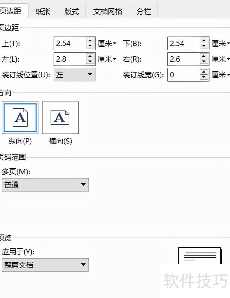 页边距设置:上2.54厘米,下2.54厘米,左2.8厘米,右2.6厘米。