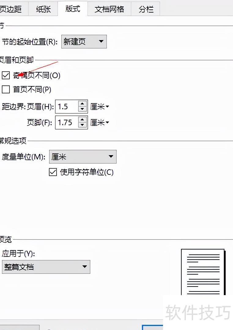 设置版式为奇偶页不同