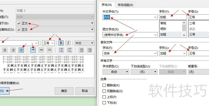 点击对话框左下角格式,分别设置字体与段落:中、西文及复杂文种字体均设为仿宋,三号字,加粗。