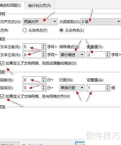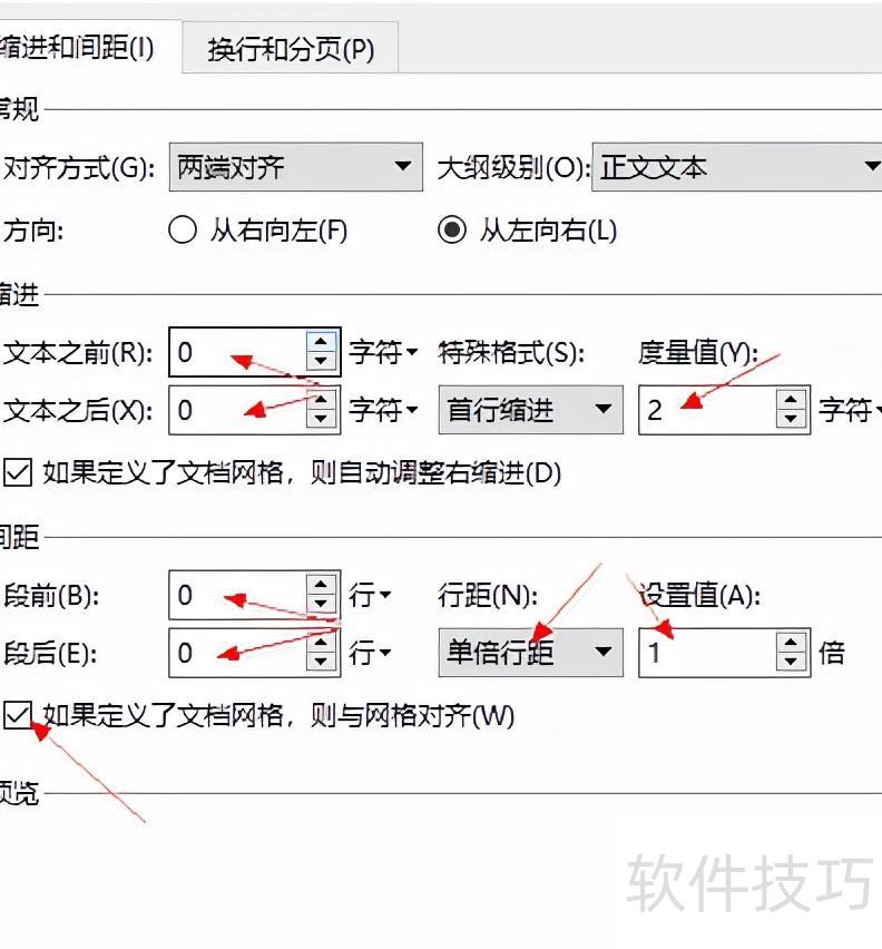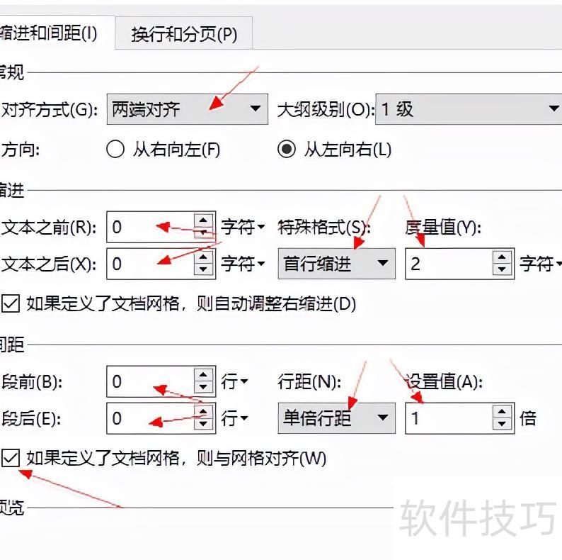 首行缩进2字符,段前段后间距为0,行距1倍,并勾选如果定义了文档网格,则与网格对齐。