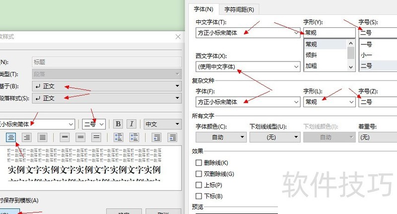 点击对话框左下角格式,依次设置字体与段落,中英文及复杂文种均选方正小标宋常规二号。
