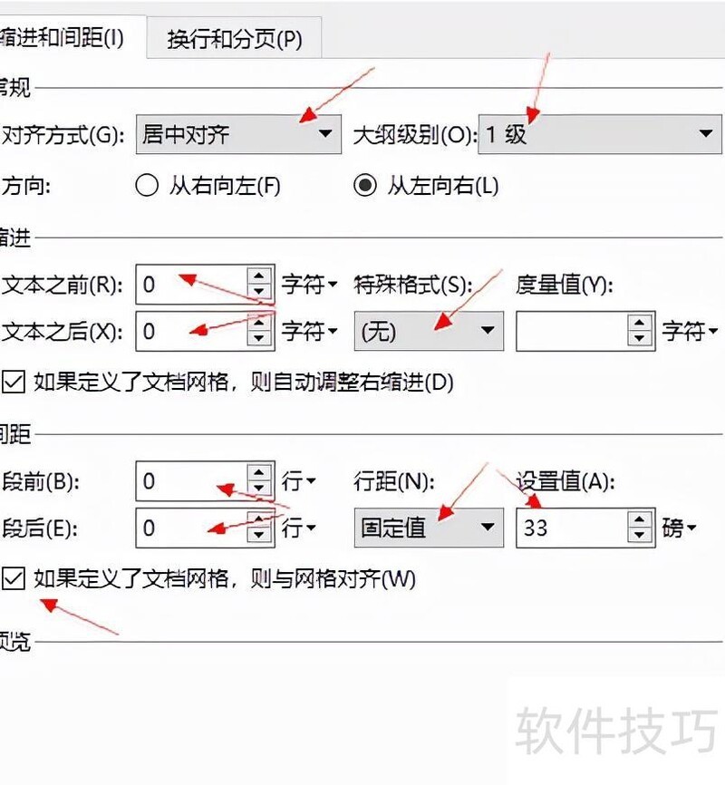 段落居中对齐,前后缩进均为0,无特殊格式;段前段后间距为0,行距设为固定值33磅,并勾选如果定义了文档网格,则与网格对齐选项。