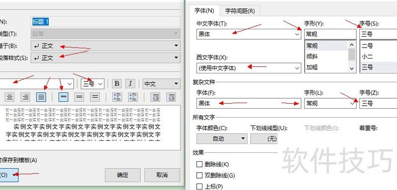 点击对话框左下角格式,依次设置字体与段落:中、西文及复杂文种字体均选黑体,样式为常规,字号设为三号。