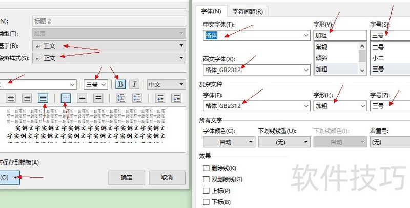 点击对话框左下角格式,分别设置字体与段落:中、西文及复杂文种字体均设为楷体,三号字,加粗。