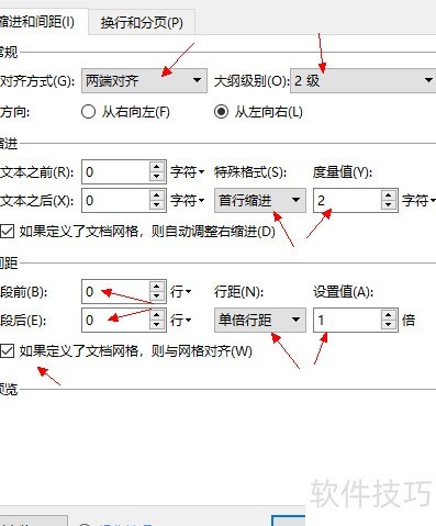 段落采用两端对齐,大纲级别设为2级;缩进前后均为0,首行缩进2字符;段前段后间距为0,单倍行距并固定值1磅;勾选若定义了文档网格,则与网格对齐选项。