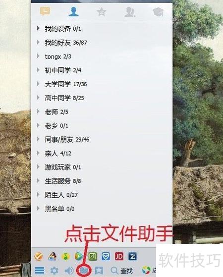 登录QQ后,找到图示下方的文件助手。若找不到该功能,可能是QQ版本过旧,建议升级至最新版本以获得完整功能支持。