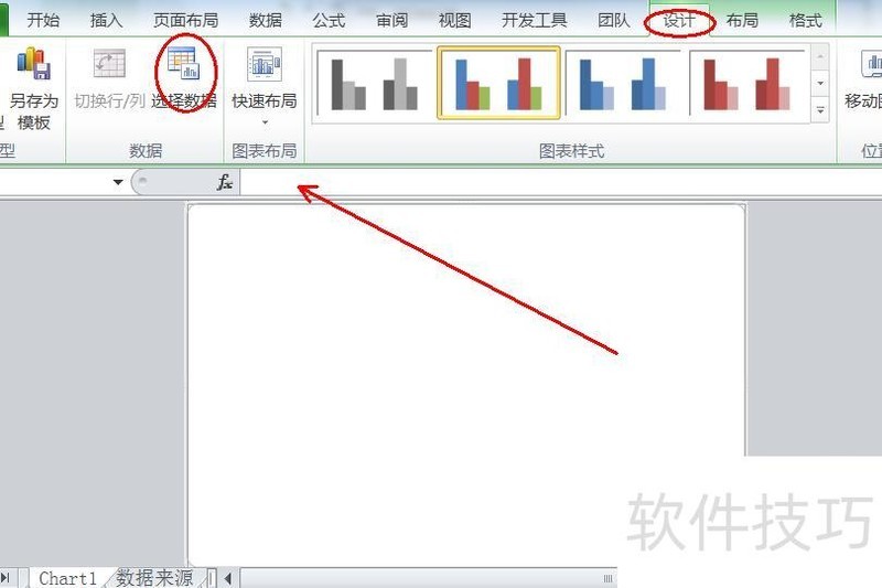 发现已生成空白图表后,在设计选项卡中点击选择数据。