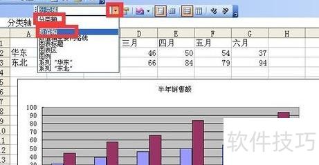 可通过图表工具栏下拉菜单选择分类轴或数值轴。