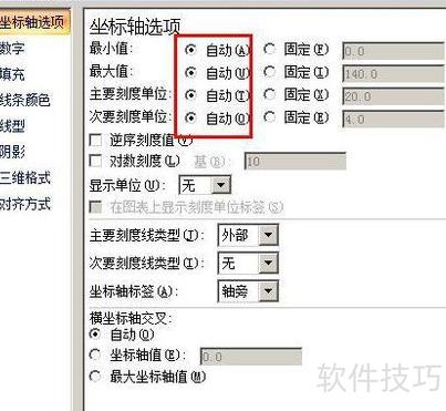 在打开的坐标轴格式对话框中,原本最大值和最小值均为自动设置,需先选择固定,再手动输入所需数值,所示。
