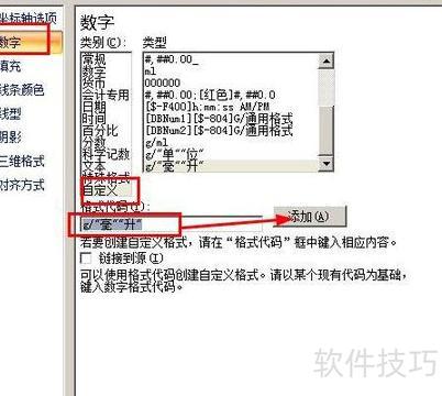 设置刻度后,点击数字选项,选择类别,在格式代码栏输入g/毫升,点击添加按钮,为数据添加单位。完成后点击关闭按钮即可。