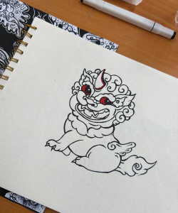 然后,别忘了画尾巴,尾巴可以画得卷卷的,像弹簧一样,翘在身后,这样,年兽看起来,就更活泼了,也更完整。