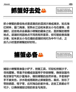 4、尊重自然,注意安全抓螃蟹是为了乐趣,但也要保护生态,太小的螃蟹,请放回大海,让它们继续长大,母蟹如果带籽,也最好放生,这样,明年还有螃蟹可抓,同时,要注意自身安全,海边岩石湿滑,小心脚下,留意潮汐时间,别被困在礁石上,享受过程,比收获更重要。