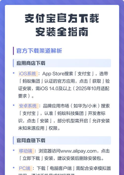 1、手机下载支付宝,其实很简单打开你的手机,找到应用商店,苹果手机叫App Store,安卓手机通常叫应用市场,或者应用商店,然后在搜索框里,输入“支付宝”三个字,点击搜索,结果列表里,那个蓝色图标,写着“支付宝”的,就是官方应用,认准它,别下错了,接着,点击旁边的“获取”或“安装”按钮,系统可能会要求你,输入密码或验证指纹,按照提示操作就行,下载完成后,应用会自动安装,你就能在桌面上,看到支付宝的图标了。