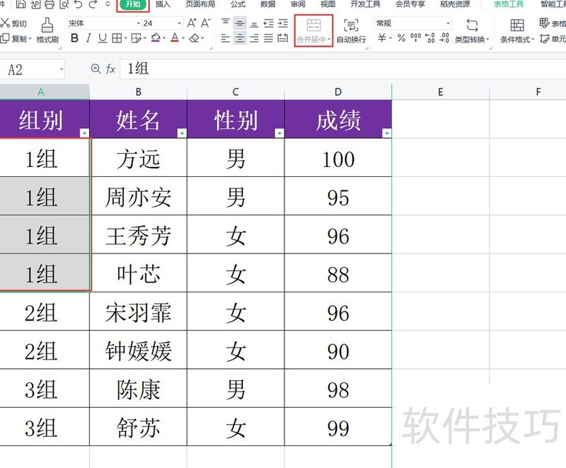 此时,选中A2至A5中内容均为1组的单元格,点击开始选项卡中的合并居中按钮,即可顺利完成单元格合并操作。