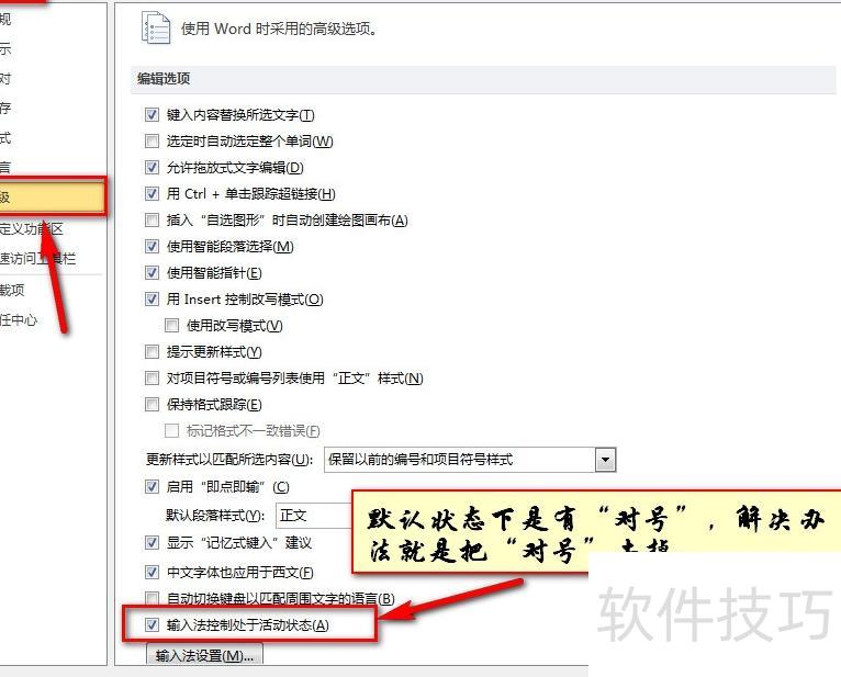 打开Word文档后,点击文件菜单,在左侧底部选择选项。进入新窗口后,点击左侧中间的高级设置,找到输入法控制处于活动状态这一项,将其前面的勾选取消即可。此操作可解决Word中无法正常切换中文输入法的问题,恢复输入法的自由切换功能。