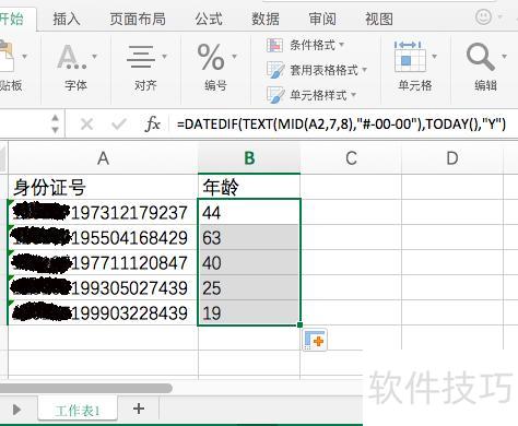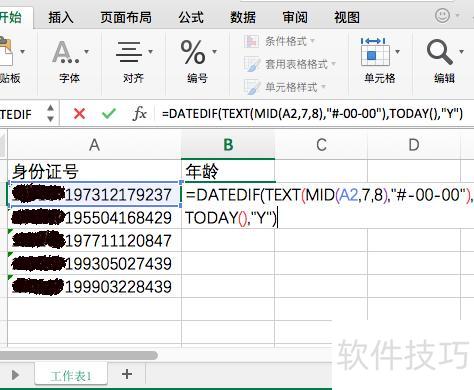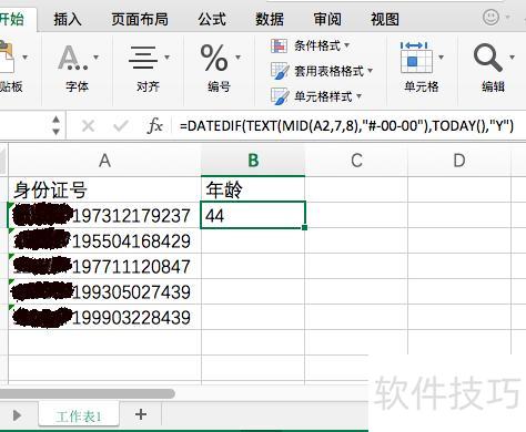 在B2单元格输入公式:=DATEDIF(TEXT(MID(A2,7,8),-00-00),TODAY(),Y),按回车键确认即可完成计算。