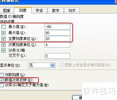 选中次坐标轴后双击,进入刻度设置。主坐标轴最大值为60,因此次坐标轴的最大值也设为60,最小值设为-60,主要刻度单位保持默认的10不变。此外,需勾选数值轴逆序选项,以实现次坐标轴数值的反向排列,确保图表显示符合预期需求。