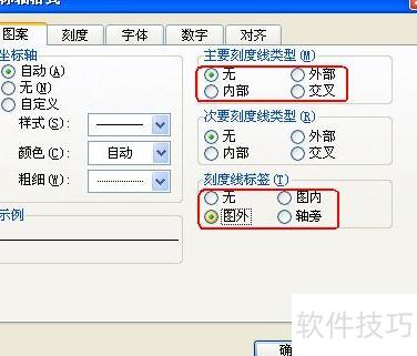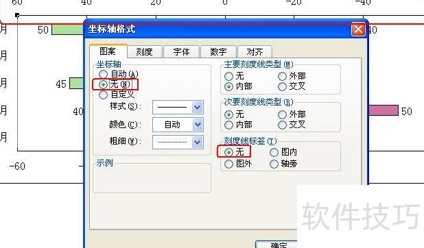 选中Y轴,双击打开坐标轴格式,图案中主要刻度线设为无,刻度线标签设置为图外。