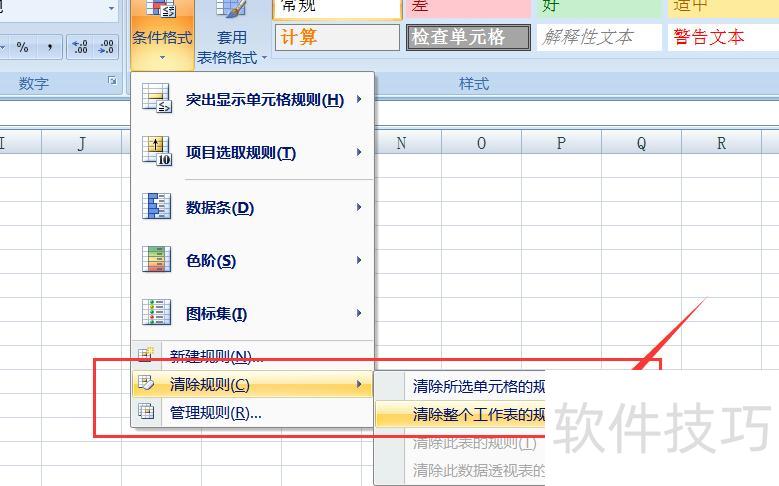 在下拉菜单中选择清除规则,然后点击清除整个工作表的规则。