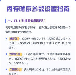 2、时序参数详解第一组数字是CL值,它最重要,代表列地址选通延迟,可以理解为内存的“第一反应时间”,这个数字越小,内存首次读取数据就越快,对游戏和日常应用影响最直接,所以选购时,要特别关注CL值。