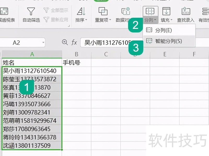 当姓名与手机号集中在同一单元格时,如何实现分列?虽然Excel用户常使用快速填充,但不妨来看看WPS中的智能分列功能如何高效完成这一操作。