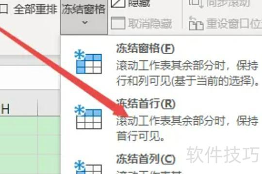 在弹出的下拉菜单中选择冻结首行命令,该功能可锁定表格第一行,使其在滚动时保持固定不消失。