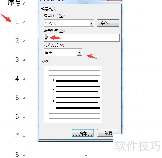 输入编号格式1,对齐方式设为居中,完成设置(但居中效果非绝对居中,需手动调整)。