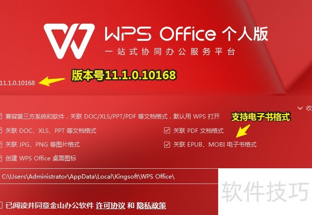 新版WPS Office安装界面焕然一新,版本号大幅升级,首次支持EPUB和MOBI电子书格式关联,充分体现了其一站式办公的宣传理念,功能整合更趋完善。