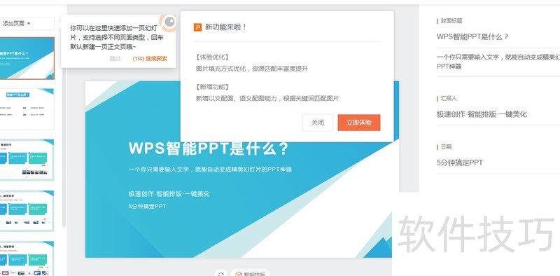 WPS与微软Office最大不同在于其持续整合办公生活所需各类应用,此次更新中,胖胖老师最青睐的便是智能PPT功能。