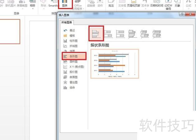 打开PPT2013,点击插入选项卡,选择图表,在图表类型中找到条形图,可选簇状、堆积、百分比及三维样式,选定后点击确定,即可插入并打开对应的条形图。