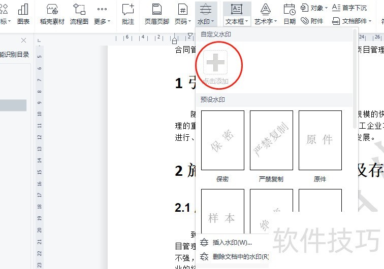 操作路径为:进入选项卡,点击功能按钮。点击后将弹出水印操作区域,上方为自定义水印设置区域,中部展示WPS预设的常用水印样式,下方设有与两个功能按钮。若使用预设水印,只需在点击按钮后,从预设选项中直接选择所需样式即可应用,例如严禁复制等常见标识。当预设样式无法满足实际需求时,可选择自定义水印功能,根据具体要求设置文字内容、字体、颜色、透明度、排列方式等参数,实现个性化水印添加,灵活适配不同文档场景,确保文档安全与规范性。