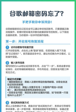 2、使用谷歌账户恢复页面这是最直接的方法,打开谷歌登录页,点“忘记密码”,系统会引导你,进入恢复流程,通常需要验证,你的备用邮箱,或者手机号码,按提示操作就行,很快会收到,验证码或链接,点击就能重置,设置新密码了。